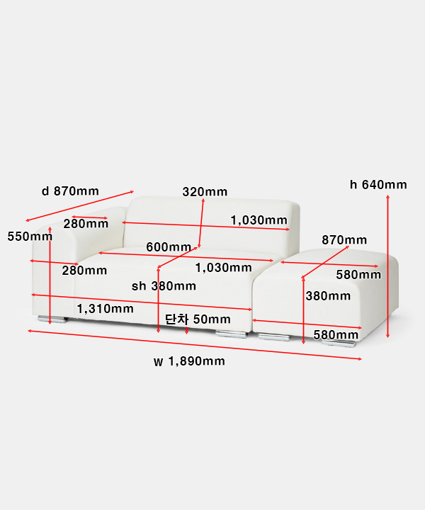 w 1,890 x d 870 x h (sh 380) 640 mm